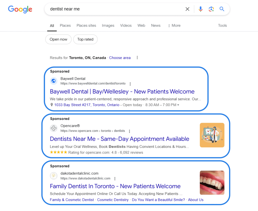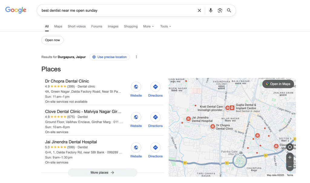 I did a quick Google search for the query “best dentist near me open sunday” and look at the top three results displayed.